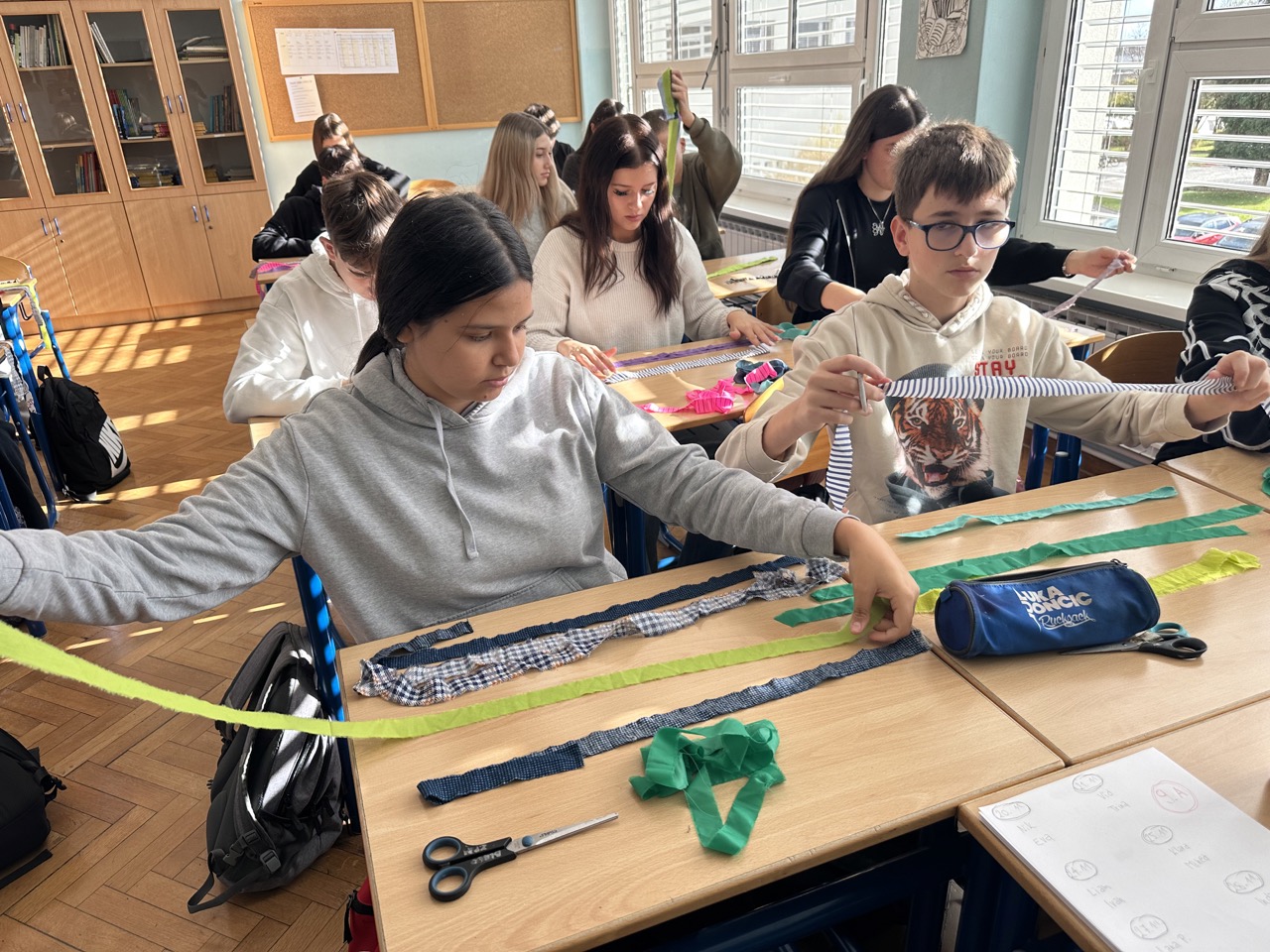 V okviru Evropskega tedna zmanjševanja odpadkov smo 17. novembra obiskali OŠ Martina Konšaka, kjer smo pripravili izmenjevalnico oblačil CUNJAMI ter tri ustvarjalne delavnice za učence 6., 8. in 9. razreda. Mladi so izdelovali našitke, šivali obeske za ključe in iz ostankov oblikovali nove uporabne izdelke.